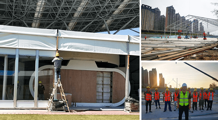 弧形展覽篷房是市場上強大和設計精良的篷房,給我們提供了靈活和可用的空間更具時代感。弧形篷房合理運用了中國傳統建筑的設計元素,將篷頂斜梁進行預彎后達到的弧形效果。